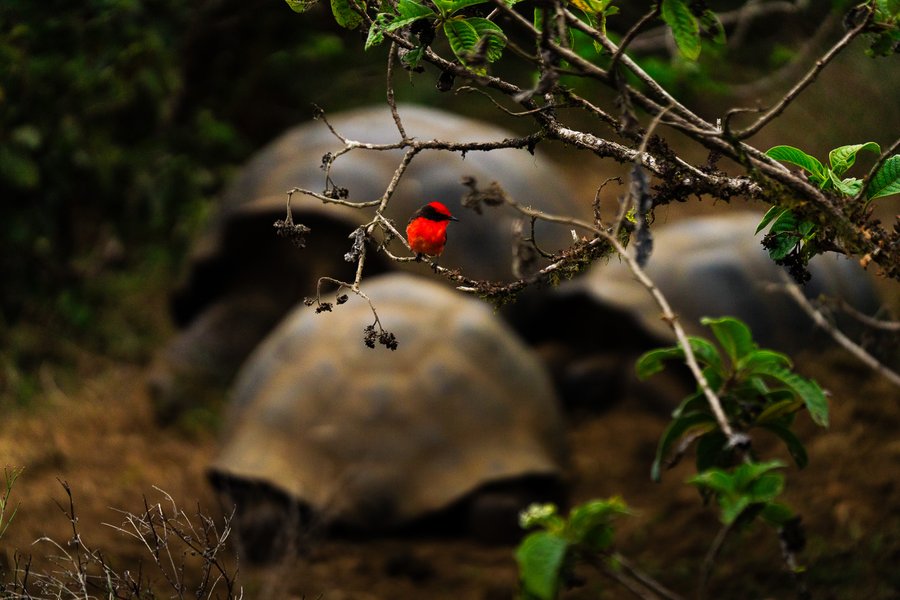 Male Little Vermilion Flyctaher (LVF) sharing its habitat with giant tortoises on Alcedo Volcano, Isabela Island