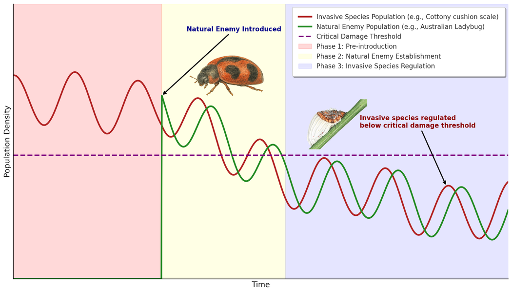 The dynamics between the ladybug and the cottony cushion scale showcase how classical biological control works: when the cottony cushion scale is abundant, ladybug populations increase, reducing the invasive insect (Fig 1). As their food decreases, the ladybug populations also decline, allowing the scale to recover slightly. This natural cycle creates a long-term balance, keeping the invasive species below the critical damage threshold. Thanks to this strategy, the ladybug has become the silent hero of many plants in Galápagos.