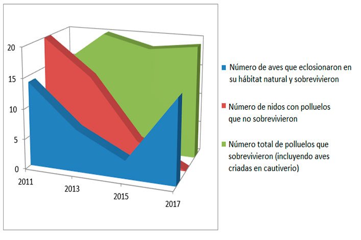 - 100% de los 14 pichones que eclosionaron en nidos en su hábitat natural sobrevivieron (en nidos tratados para eliminar el parasitismo).